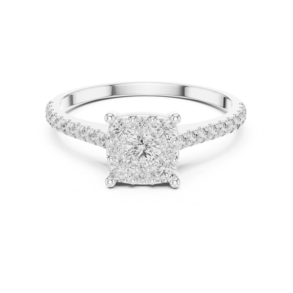 Make a breathtaking statement with our Regal Square Lab Diamond Ring. Crafted in all metal, this ring features a brilliant composite center of round lab diamonds designed to maximize sparkle. Complemented by a delicate pavé diamond band, it offers the glamorous illusion of a larger center stone with ethical, conflict-free beauty. Perfect for an unforgettable proposal.